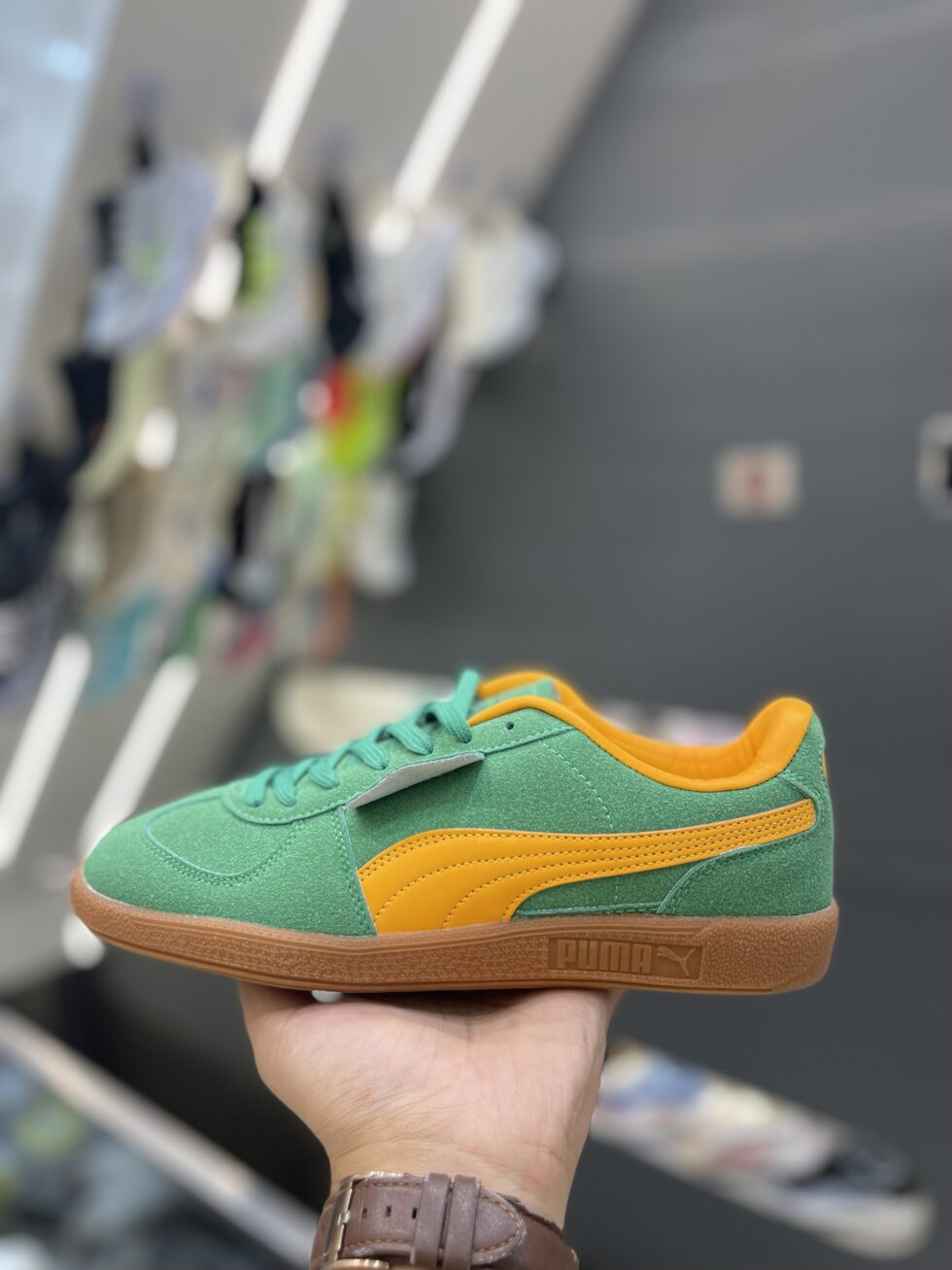 PUMA Palermo, a classic terrace-style shoe originally debuted in the early ’80s and known for its soccer heritage. This specific pair features an Archive Green suede upper with a vibrant Pele Yellow (or “Yellow Sizzle”) leather formstrip and a signature gum rubber outsole.